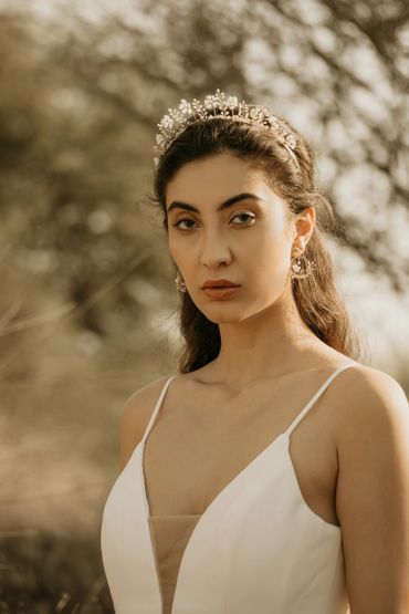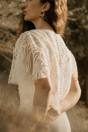 Juniper is a clean, modern fitted crepe gown with a deep plunge neckline, built in boned and cupped structured bodice and fine spaghetti straps. A low v back continues striking the balance between glamour and elegance, and a fit and flare skirt with side split finishes this effortless silhouette. The beauty of this gown is in the simplicity, the shape and the fabric. It has been designed with versatility in mind being able to easily add on those glamorous accessories, one being the beaded Scarlett cape topper, that features in Hidden Essence, or even the sleeves from the Alora dress.
