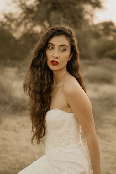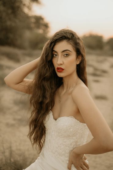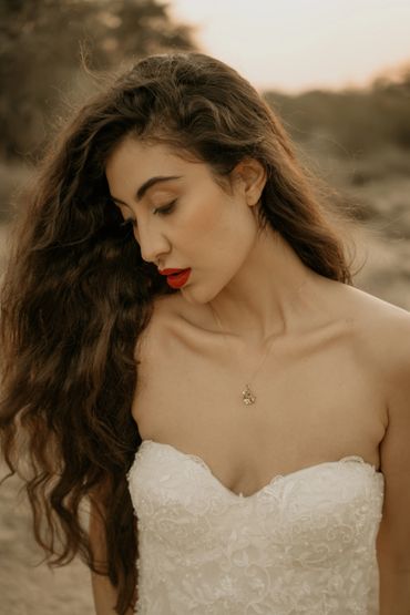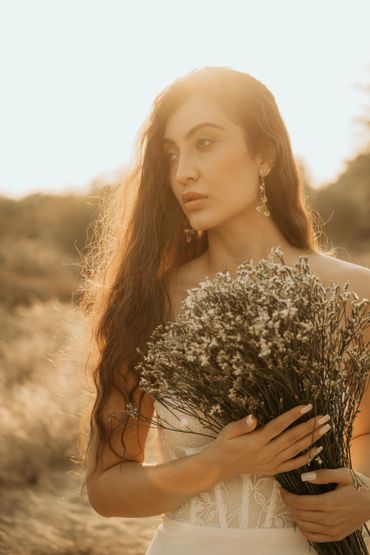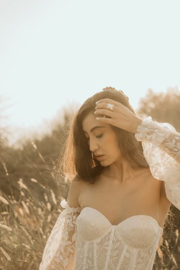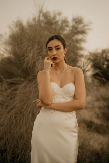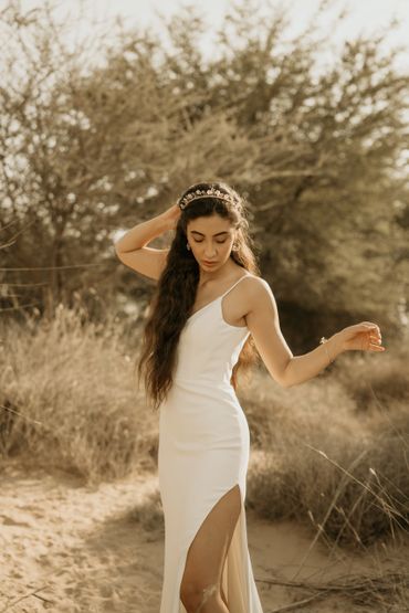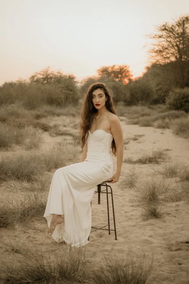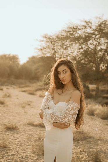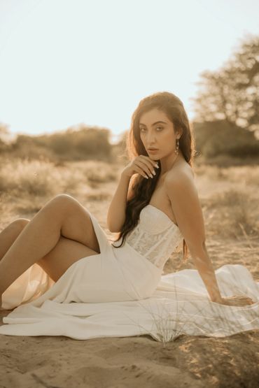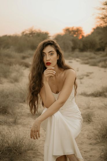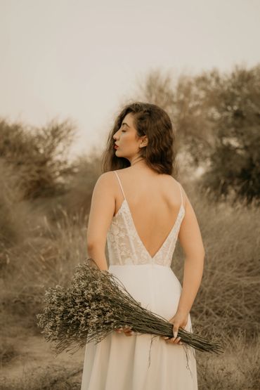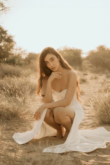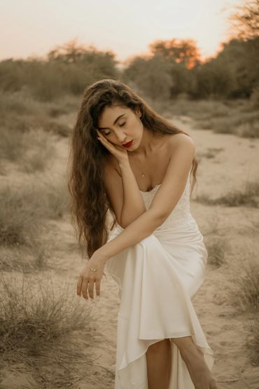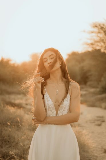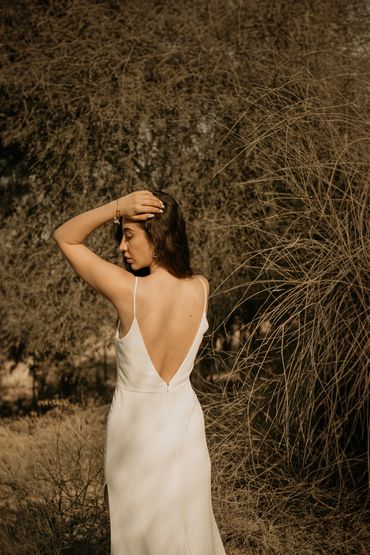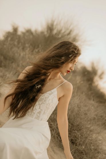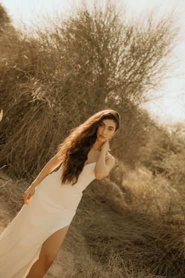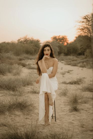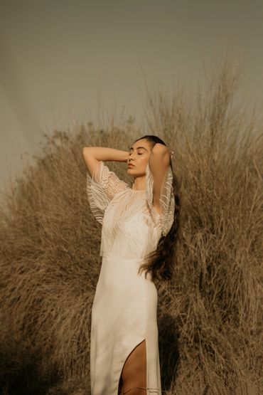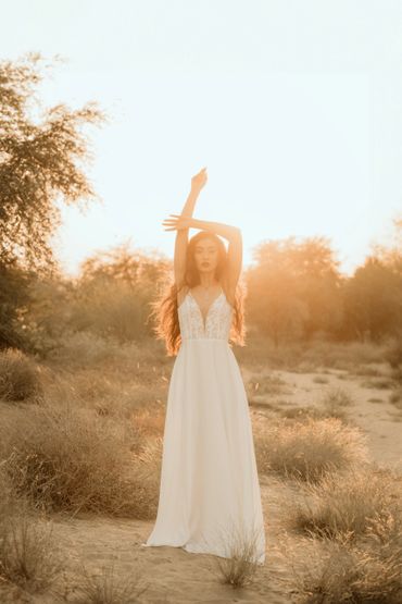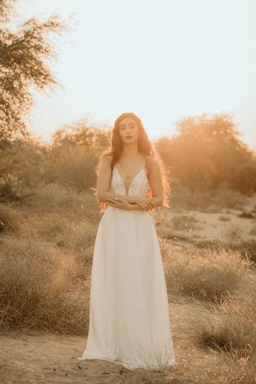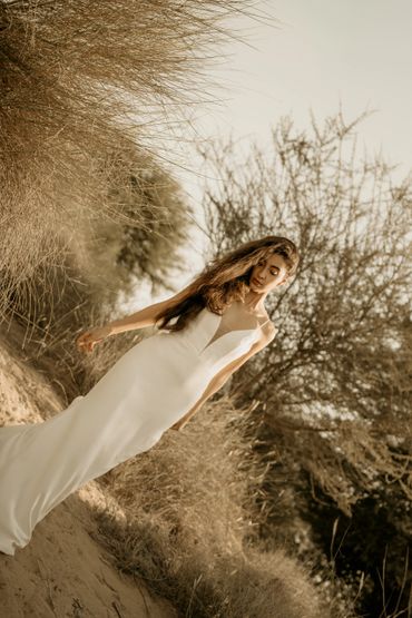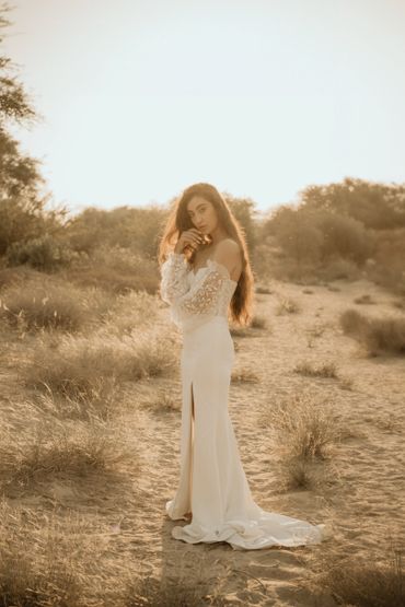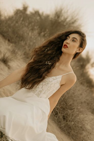 This collection is all about sophistication with a sense of nostalgic soft romance. Shot around a desert lake in the sand and scrubland, this collection takes inspiration from the desert sunlight and warm hazy sunsets, with the dresses exuding an evocative laid-back sense of feeling and romantic movement.
