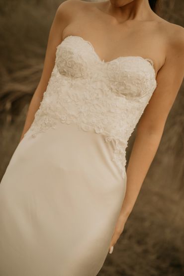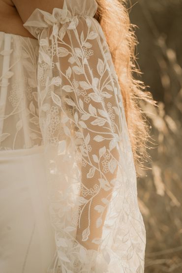 Wren features a fuller skirt shape in gorgeously fluid satin back eco crepe. The plunge neckline bodice is the same fit and shape as Juniper but is made from a heavily embroidered organic cotton floral lace. It is a striking lace in pattern, which works wonderfully with the clean satin back crepe in the skirt. Fully boned, and lined in a fine silk habotai to give a touch of sheerness which exposes the wonderful lace motif even more, this dress contains wonderfully intricate details despite its deceptively simple silhouette. This again is another versatile gown in that you can easily pair with matching lace puffed sleeves or fitted off the shoulder sleeves.