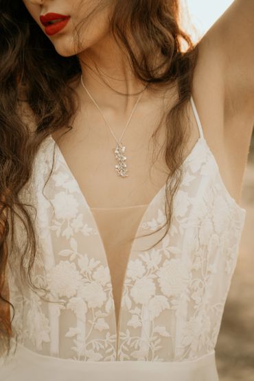 Bringing glamour to the proceedings, Ariana’s beaded and pearl encrusted bustier bodice has swoon-worthy removable tulle sleeves, making it feel almost like two dresses in one. The silk bias cut skirt has the most flattering drape, finishing off this show-stopping gown.